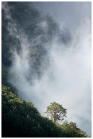 Lush green mountainside enveloped in mist and fog, featuring a solitary tree.