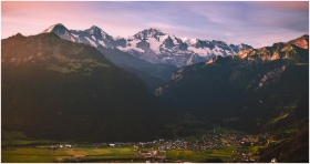 Breathtaking aerial view of majestic snow-covered mountains at sunset over a quiet valley town.