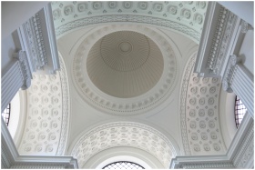 A stunning view of an ornate white dome ceiling with intricate architectural details.