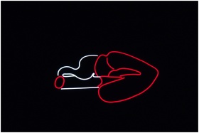 Striking neon sign of lips with a cigarette glowin