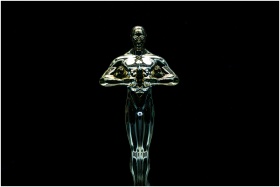 A golden trophy statue isolated on a black background symbolizing achievement and victory.