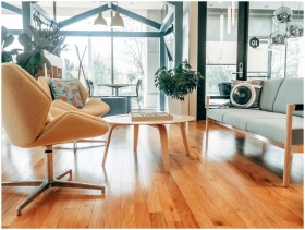 Elegant modern living room featuring chic furniture, warm lighting, and wooden flooring.