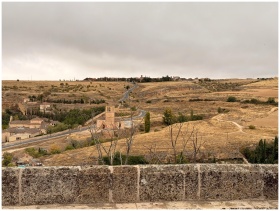 Scenic view of Segovia's rolling fields and historic architecture under a cloudy sky.
