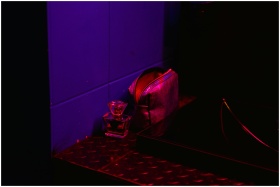 A shot glass and purse illuminated by vibrant nightclub lighting.