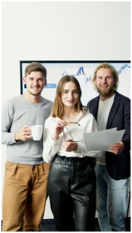 Dynamic team of young professionals collaborating in a modern office with charts in the background.