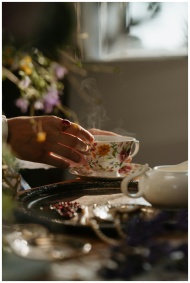 A feminine hand grasps a steaming floral porcelain tea cup on a silver tray.
