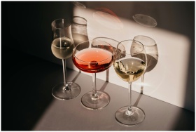 Elegant arrangement of three wine glasses casting distinct shadows in warm light.