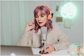 Woman podcaster in a cozy room speaking into a microphone, wearing headphones.