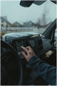 Hand using smartphone GPS inside car on a cloudy d