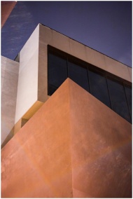 Low-angle shot of a modern building featuring geometric shapes and glass windows.