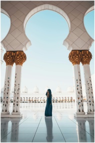 A person in traditional attire standing among columns of the Sheikh Zayed Mosque in Abu Dhabi.