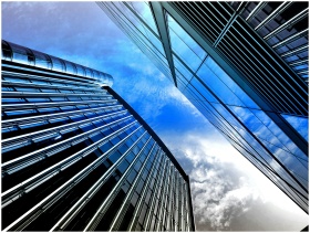 A low angle view of skyscrapers reaching into a mo