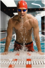 Athletic man in goggles and swim cap emerging from