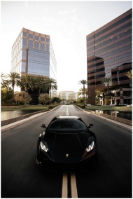 Black Lamborghini driving on a city street flanked