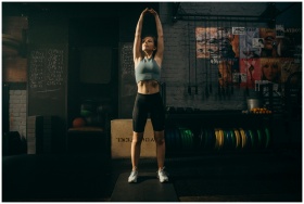 Strong woman stretching her arms in an industrial-style gym environment with motivational wall art.