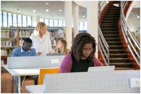 Diverse group of students studying in a modern university library with focus on diligent learning.