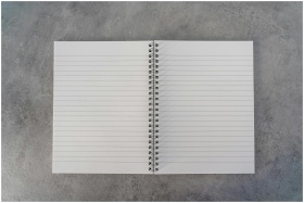 Top-down view of an open spiral notebook with line