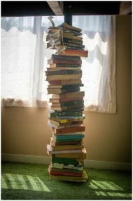 A tall stack of books casting a shadow near a sunlit window, indoors setting.