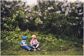 Two children sitting in a lush garden surrounded by blooming lilac bushes, enjoying a summer day.