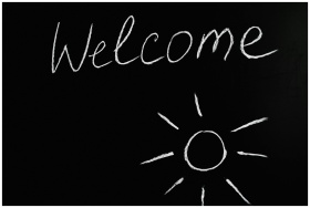 Chalk-drawn 'Welcome' and sun illustration on a black chalkboard background.