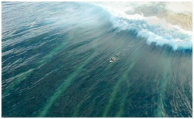 Breathtaking aerial shot of a surfer navigating the waves in Malé, Maldives.