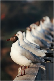 A line of seagulls with black heads perched along