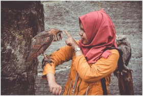 A woman wearing a hijab interacts with owls perche