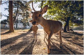 A close-up shot of a deer in Nara Park, Japan, sho