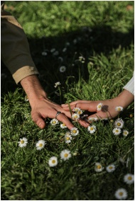Two hands gently touch among blooming white daisie