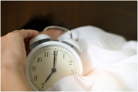 A close-up of a hand reaching for a ringing alarm clock, symbolizing waking up in the morning.