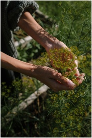 Hands gently harvesting fresh dill in an outdoor g