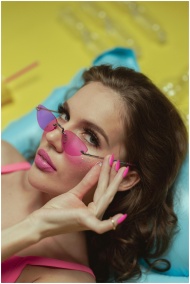 Stylish woman with pink sunglasses posing on yello