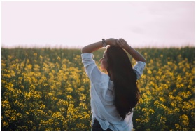 Woman in white shirt enjoying a sunny day in a blooming flower field.
