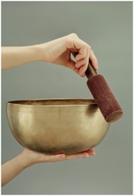 A close-up of hands holding a Tibetan singing bowl