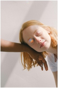 A serene interracial moment with a rainbow reflect