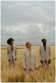Three fashionable models wearing beige suits standing in a wheat field under a cloudy sky.