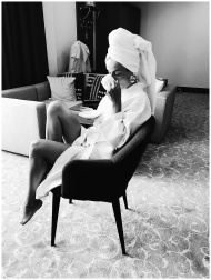 Chic woman in a bathrobe and towel turban, enjoying a drink indoors.