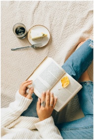 Woman enjoying leisure time at home with a book, coffee, and cheesecake on a cozy blanket.