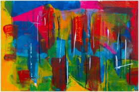 Colorful abstract acrylic painting featuring dynamic shapes and vibrant hues on canvas.