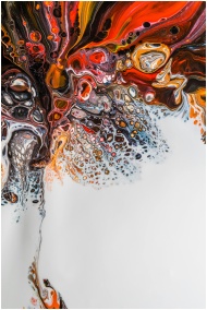 A captivating fluid art piece featuring vibrant swirls and patterns in reds, oranges, and whites.