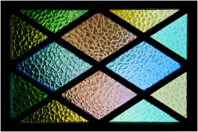 Vibrant stained glass featuring textured geometric patterns and colorful hues.
