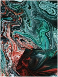 A vibrant abstract painting featuring swirling patterns in red, green, and white hues.