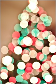 Festive abstract bokeh image of Christmas lights creating a blurred colorful pattern.