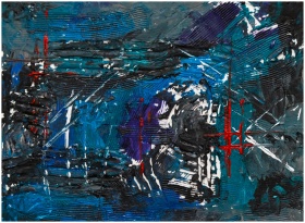 Vibrant abstract artwork featuring bold blue hues and expressive brush strokes.