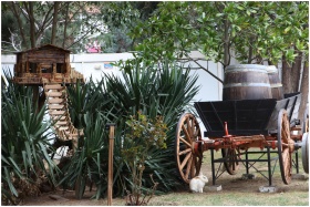 Vintage cart and wooden treehouse in a garden setting in İstanbul.