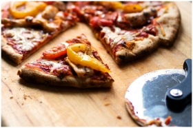 Close-up of sliced pizza with pepperoni, cheese, and bell peppers on a wooden board.