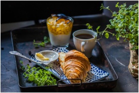 A cozy breakfast setup featuring a croissant, butt