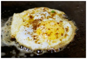 Mouthwatering fried egg with crisp edges cooking on a hot frying pan.