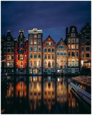 Charming canal houses along Amsterdam's waterfront, beautifully lit at dusk.