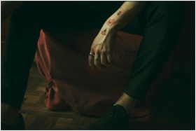 Artistic close-up of a man with tattoos sitting indoors, exuding a dark and moody atmosphere.